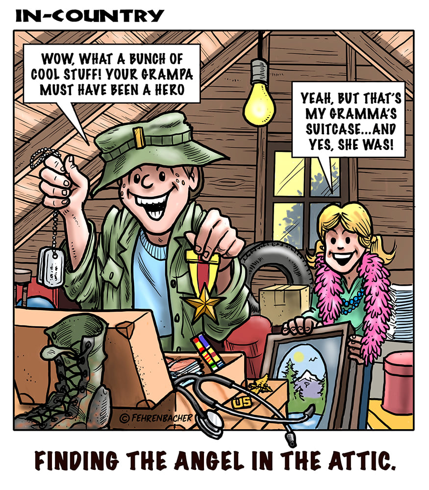 Phil enlisted in the Army in 1965 where you served for years in Vietnam.  He became a graphic designer and has worked for the state of Oregon for 26 years.  He retired in 2003 and started the Cartoon "In-Country".  The cartoons reflect his experiences during his tour of duty in South Vietnam.